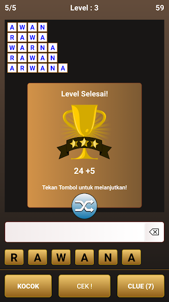 Le jeu d'anagramme indonésien a des centaines de niveaux, vous devez terminer chaque niveau en répondant correctement à tous les mots demandés, chaque niveau du jeu sera terminé si tous les mots demandés ont été répondus, vous obtiendrez des points ou des scores du nombre de personnages que vous avez compilés avec succès.